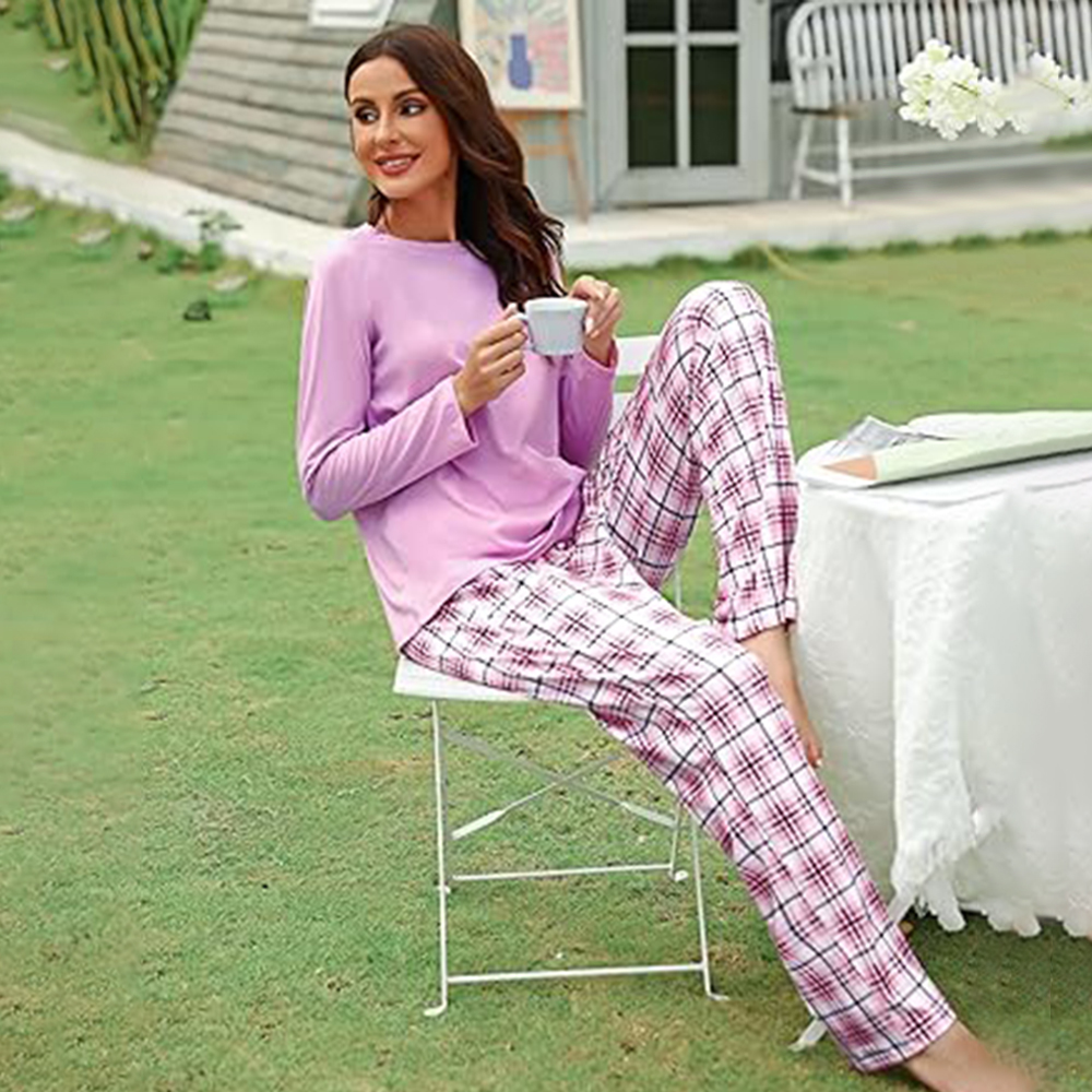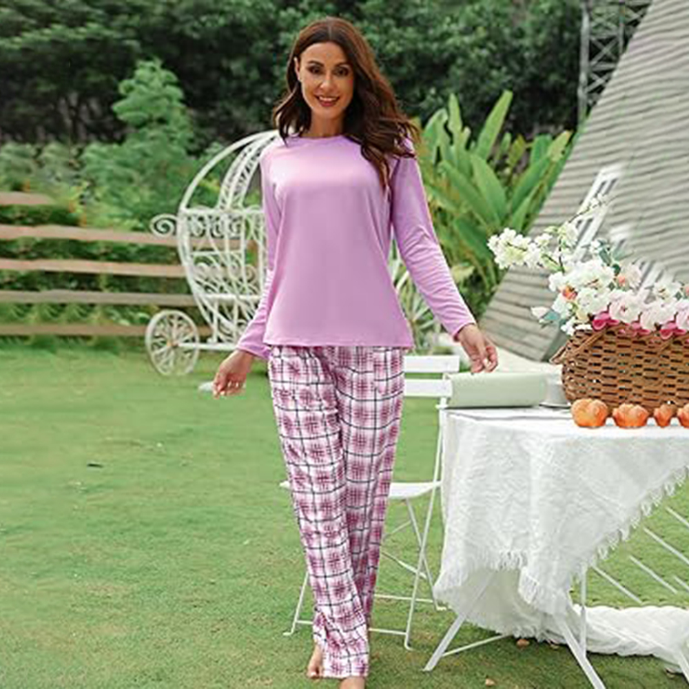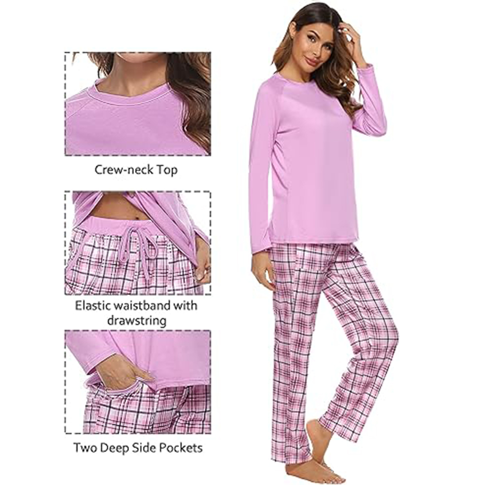 • 2 piece sleepwear includes a long-sleeve sleep tee and a pair of wide leg plaid pajama pants. The colorblock design would make a very unique and refreshing outfit that makes you feel good at home.